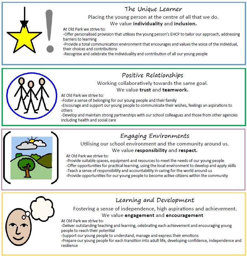 At Old Park our vision, mission and values are driven by four key areas: the unique learner, positive relationships, engaging environments, learning and development. These are at the centre of our school ethos and the principles of each are shared by all members of our school community. They are underpinned by our culture of safeguarding. Each area is used to develop the provision we provide now, tomorrow and in the future.